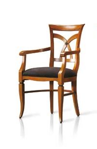Стул на каркасе из древесины. Передние и задние ножки соединены изящной проногой в виде полукольца. Жесткая спинка оформлена оригинальным Х-образным элементом.