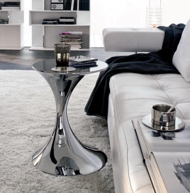 Оригинальный журнальный столик в современном стиле. Имеет асимметричное основание и стеклянную столешницу.