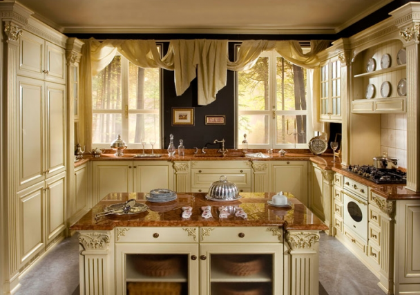 Кухонный гарнитур в классическом стиле. Каркас – массив древесины. Рельефные фасады также выполнены из массива, окрашенного в кремовый цвет. Рабочая поверхность - из натурального мрамора.Роль переходов между элементами модульной системы играют пилястры с выдвижными секциями для хранения. Дизайн модели подчеркивает богатый резной декор и отделка позолотой.