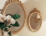 Шикарное зеркало овальной формы, богато украшенное гипсовой узорчатой лепкой.