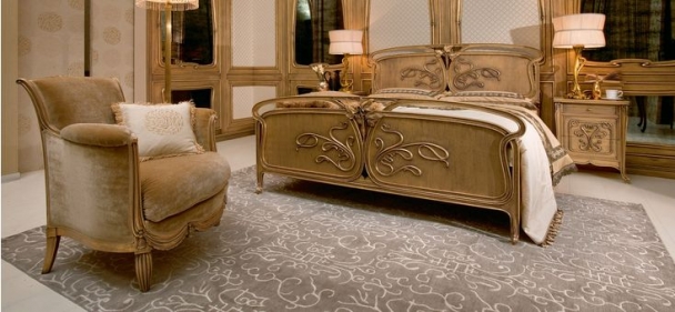 Изысканная кровать с шикарной резной отделкой с фигурными ножками с светлых сортов дерева.