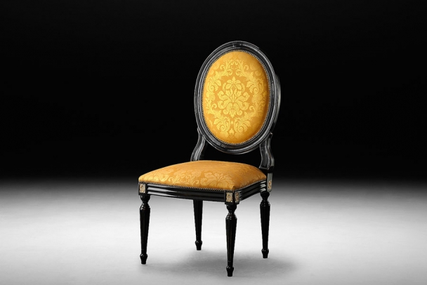 Стул из дерева ценных пород окрашенный в чёрный цвет. Спинка овальной формы. Обивка атласная.